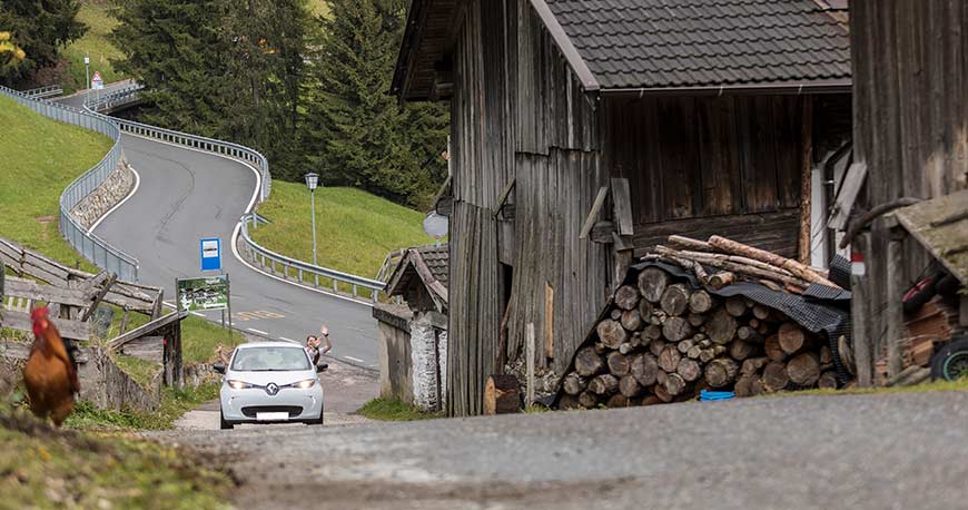 Mit dem E-Mobil fährt man geräuscharm, völlig geruchlos und emissionsfrei durch Südtirols Berge. Wer den hoteleigenen Renault Zoё zum ersten Mal fährt, wird vom unmittelbaren Anspruch und der raschen Beschleunigung begeistert sein, auch auf moderne Assistenzsysteme wie Einparkhilfe, Rückfahrkamera und Berganfahrhilfe muss man nicht verzichten. Der kleine Elektroflitzer ist also alles andere als lahm und macht richtig Spaß.